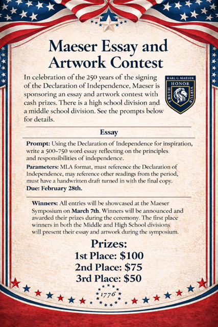 In celebration of the 250 years since the signing of the Declaration of Independence, Maeser is sponsoring an essay and artwork contest with cash prizes. There is a high school division and a middle school division.