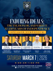 In celebration of America250, please join us on Saturday, March 7th, from 9am-1pm for our 2nd Annual Symposium, including 5 incredible speakers, performances by the Maeser Orchestra, a raffle, and more!